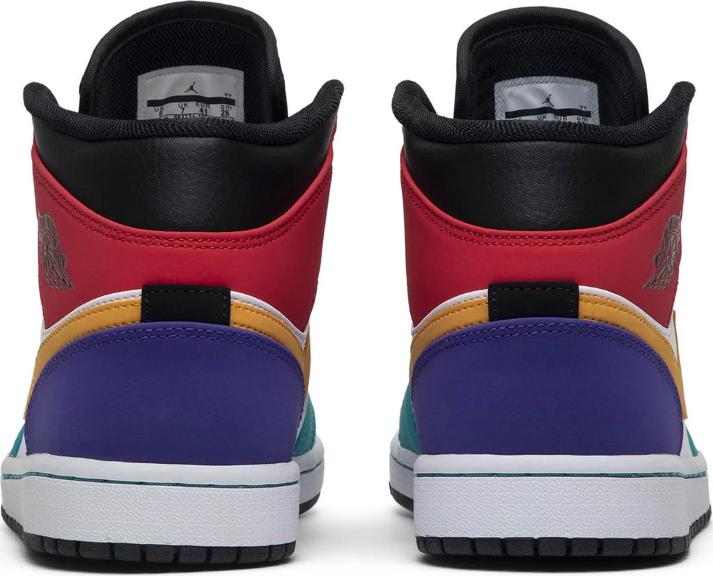 O Air Jordan 1 Mid 'Multi-Color' apresenta um design inspirado no conceito 'What The' da Nike, reunindo tons conflitantes para acentuar uma base clássica inspirada em Chicago. Este último é facilmente visto no dedo do pé e na gola, ambos em preto e vermelho. Um painel lateral de couro branco, sobreposto com um Swoosh de couro laranja, é ladeado por pops contrastantes de Turbo Green e roxo.